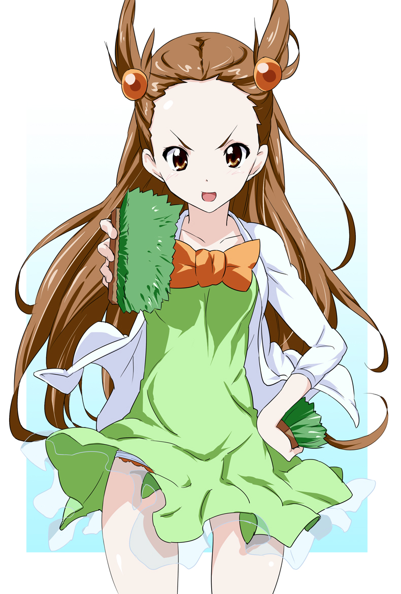 kimizuka aoi, takai sayaka, pia carrot (series), pia carrot e youkoso!!, pia carrot e youkoso!! 3, highres, 1990s (style), 1girl, brown hair, cowboy shot, female focus, pantyhose, red eyes, ribbon, solo, standing, waitress