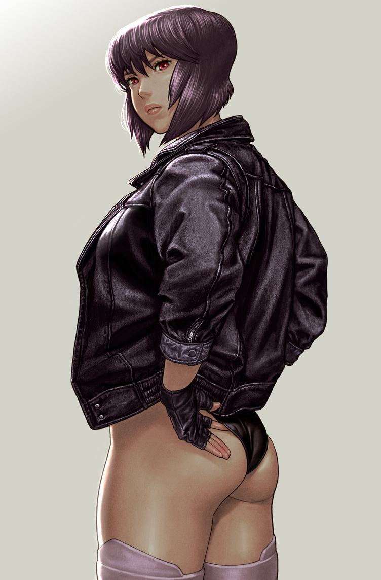 1girlassblack pantiescowboy shoteyelashesfemale focusgrey backgroundjacketleatherleather jacketno pantspantiesshort hairsimple backgroundskindentationsolothighhighsunderwearwhite thighhighs