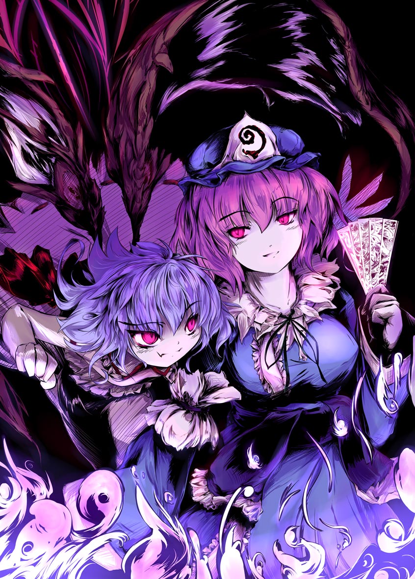 2girlsbreastsevil smilefemale focusfolding fanhand fanhatholdingjapanese clotheskimonolarge breastslooking at viewermob capmultiple girlspurple hairred eyesshaded faceshort hairsmiletriangular headpiece