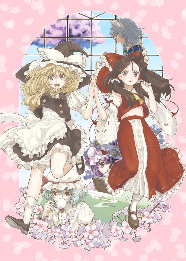 :o5girlsblonde hairblue hairbookbowbraidbrown haircherry blossomscolored eyelashescupdetached sleevesdrinkingeyelashesfemale focushatholding handslong hairmultiple girlsopen bookopen mouthpurple eyespurple hairreadingred eyesshort hairsmileteacuptwin braidswitch hatyellow eyes