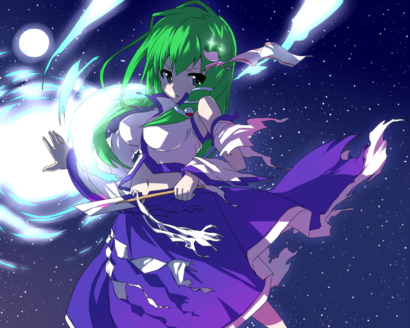 1girlbreastsdetached sleevesfemale focusfroggreen eyesgreen hairhair ornamentjapanese clotheslong hairmikoskysnakesolostanding