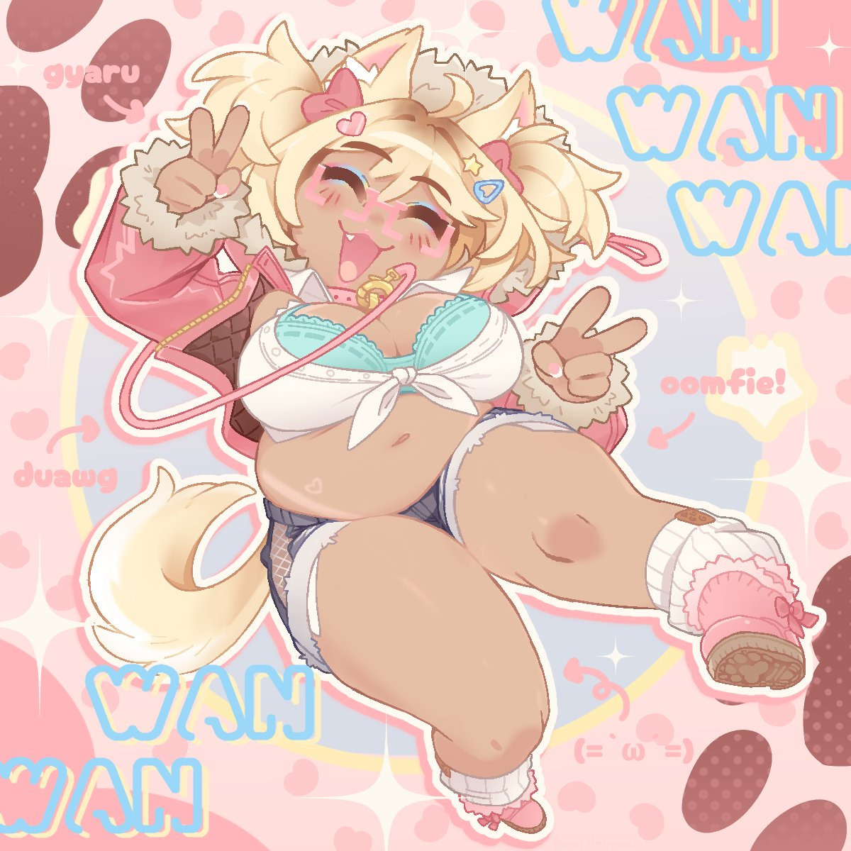 1girlahogeanimal earsaqua braarrow (symbol)blonde hairblue shortsblushbootsbrabreastsbuttonscleavageclosed eyescollardog girldouble vfacing viewerfangglasseshair ornamenthaircliphead tiltheartjacketlarge breastslong sleevesnavelofficial alternate hair coloropen mouthoutlinepink backgroundpink bootspink collarpink jacketpink leashpink-framed eyewearplumpshort shortsshortssockssolotantanlinethick thighsthighsunderwearvvirtual youtuberwhite outlinewhite socksyellow tail