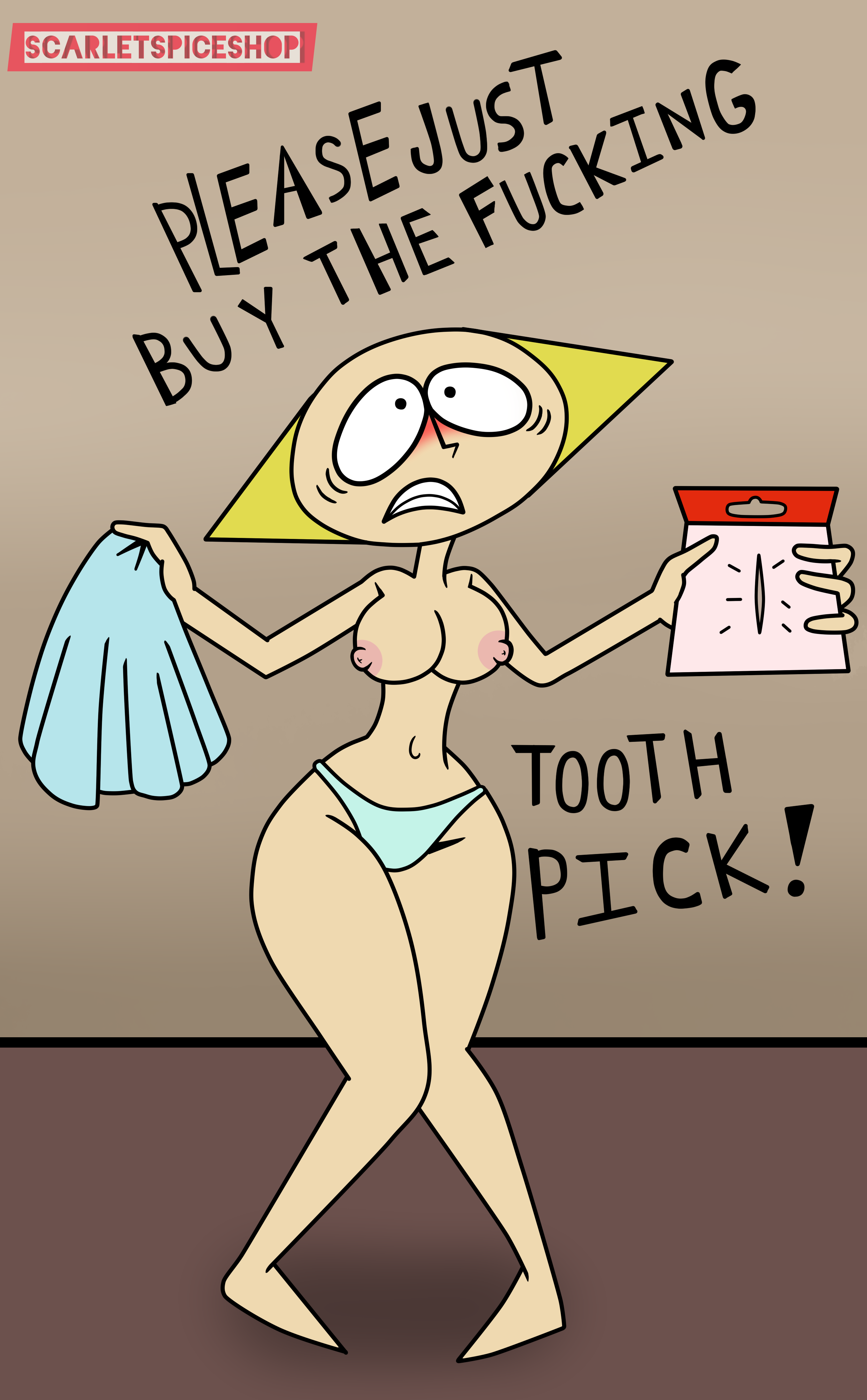 1girlsbeggingblonde hairblushbustydialogueFlag for Deletiongritted teethhalf nakedholding clothingholding objectlooking at viewerpanickingpantiessally (sheep in the big city)scaredscarletspiceshoptoothpick