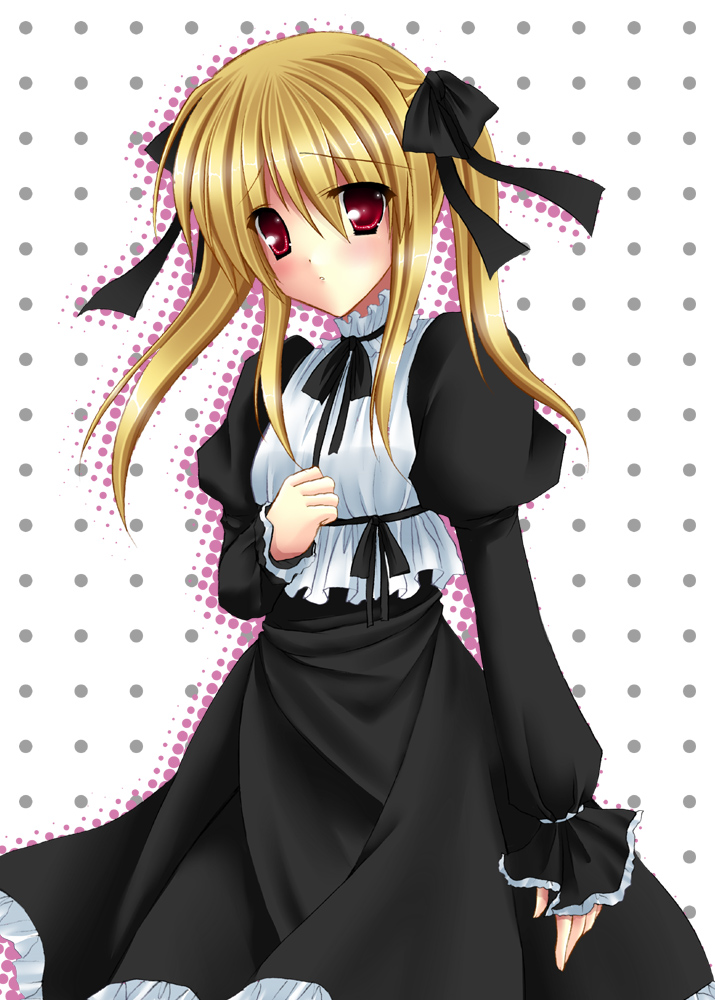 1girlblonde hairbowdressfemale focusfrillsgothic lolitahair bowhalftonehalftone backgroundlolita fashionred eyesribbonsolotwintails