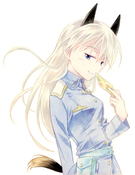 00s1girlanimal earsblonde hairblue eyesbreastsfemale focusfrom sidegrinhand upholdinglong sleeveslooking at viewerphoto (object)simple backgroundsmilesolotailupper bodywhite backgroundwhite hair