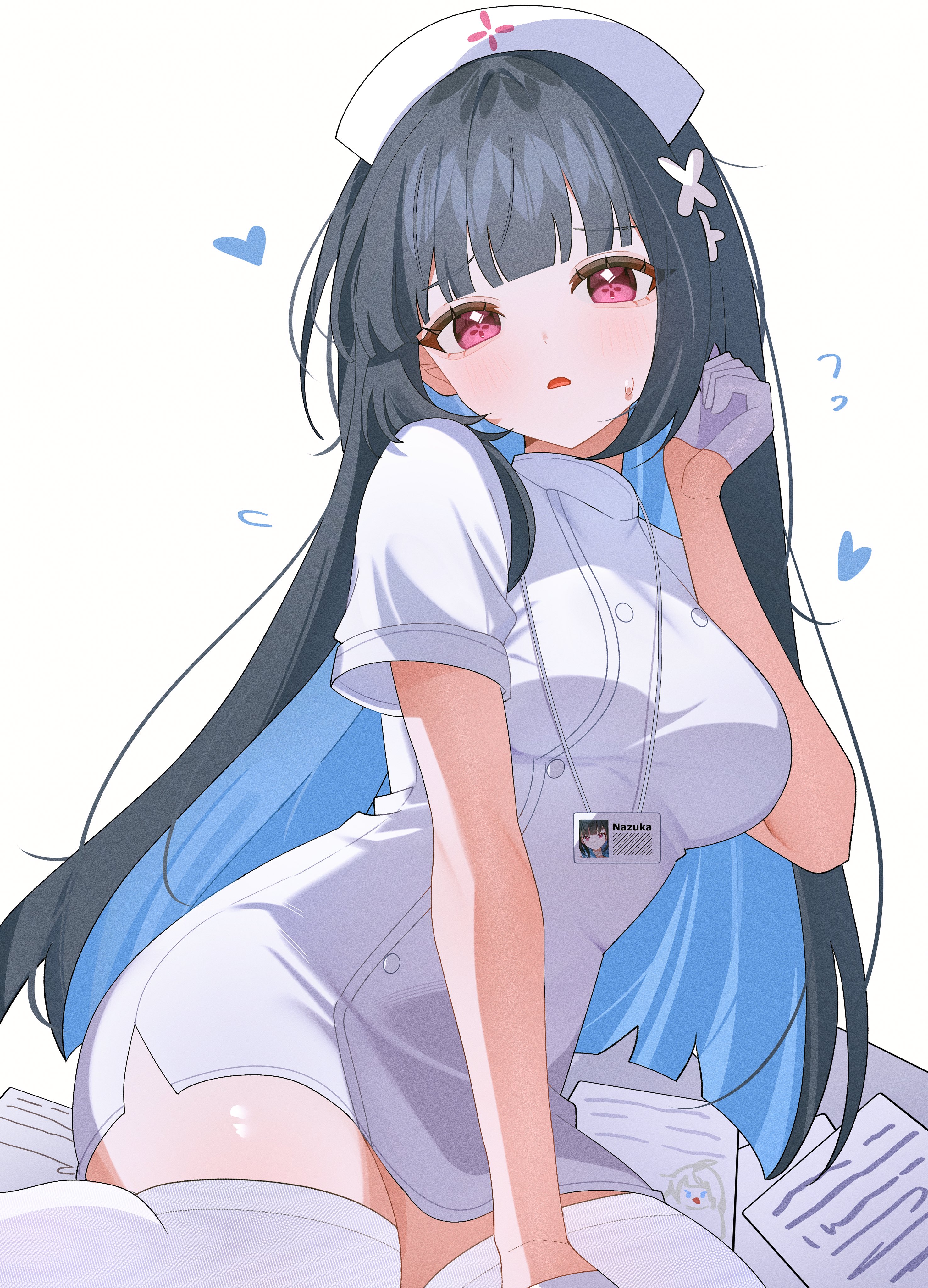 1girlalternate costumearm supportblack hairblue hairblunt bangsbreastscolored inner hairextra pupilsflying sweatdropsgloveshair ornamenthalf gloveshathead tiltlarge breastslooking at viewermulticolored hairnursenurse capopen mouthpaperworkred eyessimple backgroundsolosweatdropthighhighstwo-tone hairwhite backgroundwhite gloveswhite thighhighsx hair ornamentzettai ryouiki