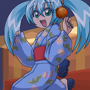 00s1girlblue hairfeetfemale focusflower printfoodgreen eyesholdingholding foodjapanese clotheskimonoopen mouthsandalssmilesolotwintailszouri