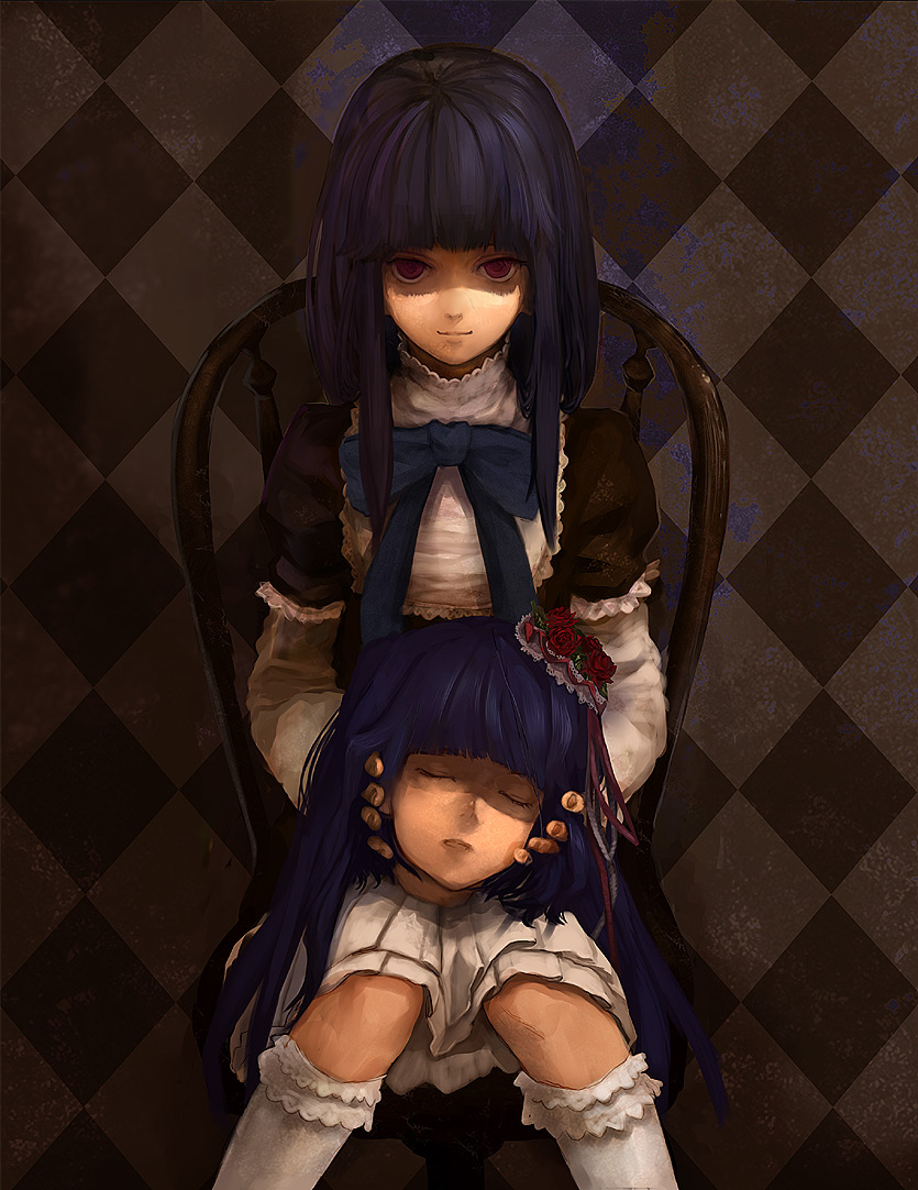00s2girlsblue hairbowdressfrillsmultiple girlspurple eyespurple hairsevered headsmilethighhighs