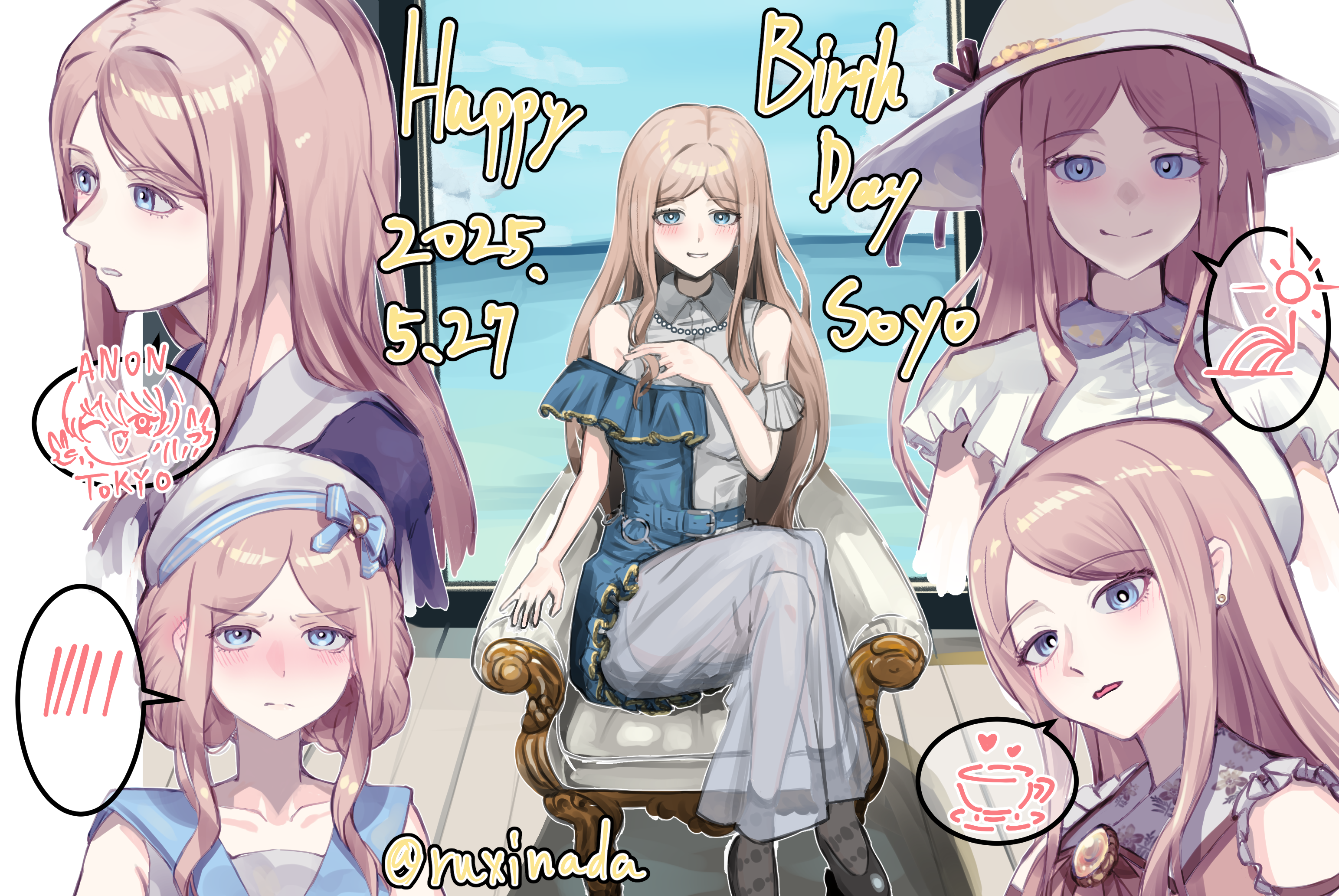1girlanon tokyo (bang dream!)beretblue eyesbrown hairchairclothing cutoutcrossed legsdatedhappy birthdayhatlong hairmultiple viewsschool uniformshort hair with long locksshoulder cutoutsidelockssittingsolospoken blushtsukinomori school uniformwhite backgroundwhite hat
