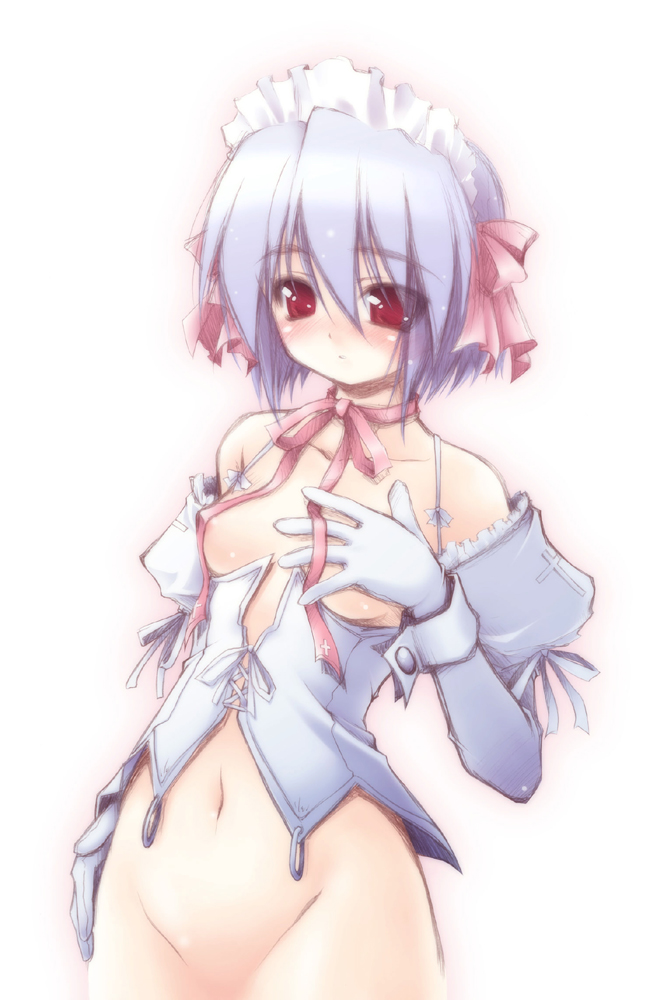 1girlblue hairblushbonnetbottomlessbreastscovering breastscovering one breastcovering privatesfemale focusglovesnavelnipplesno pantiesred eyesribbonshort hairsolo
