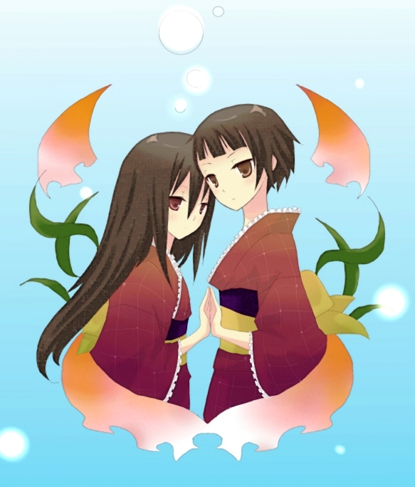 00s2girlsblack hairbob cutbrown eyesjapanese clotheskimonolong hairmultiple girlsred eyesshort hair