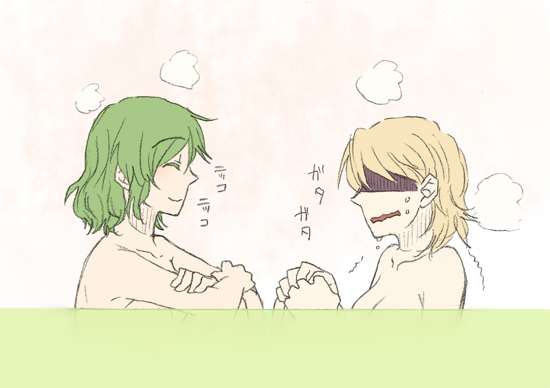 2girlsarmarm restarmsbare shouldersbathblonde hairbreastscleavageclosed eyescrossed armsfemaleFlag for Deletiongreen hairmultiple girlsnervousnudeopen mouthscaredshaded faceshort hairshysittingsmilesteamsweattremblingwaterwavy mouthwetyoukaiyuri