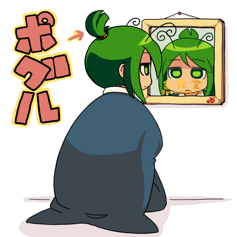 1girlalternate hairstyleantennaefemale focusgreen eyesgreen hairmatching hair/eyesmirrorponytailshort hairsolotext focuswhite background