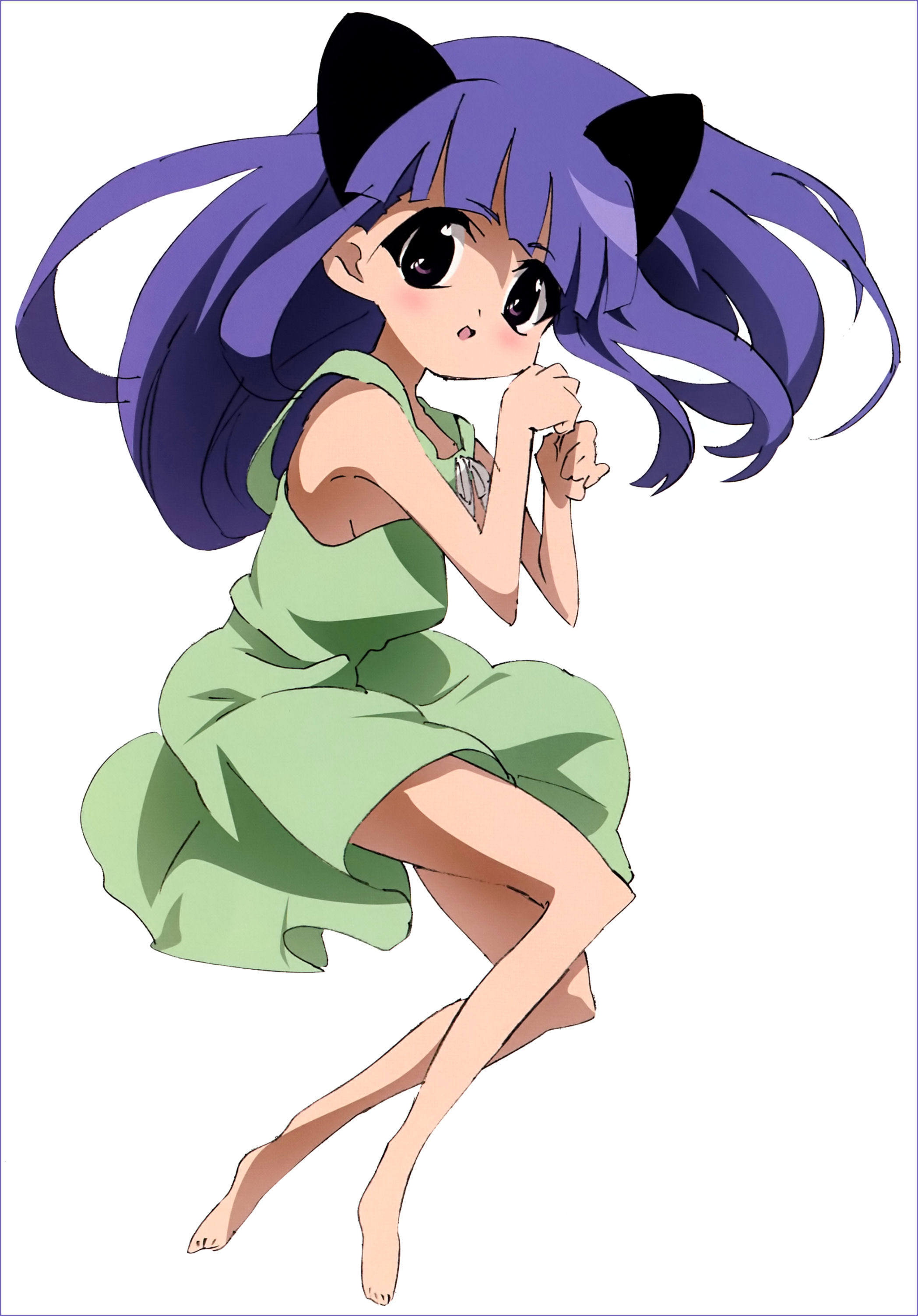 00sanimal earsbarefootblue hairblushbreastscat earsdressflat chestlong hairpurple eyessideboobsimple backgroundsundress