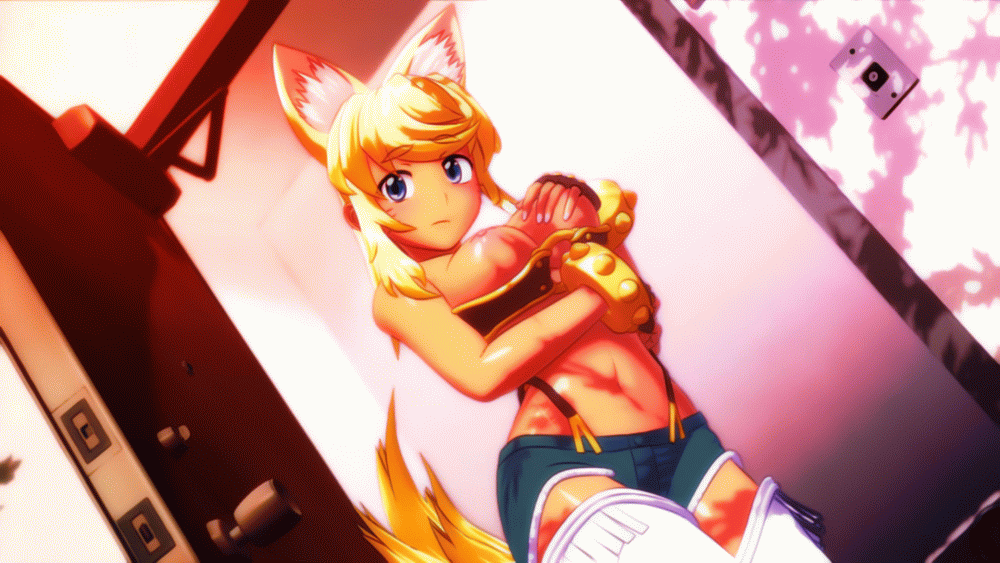 1girlsanimal earsblonde hairblue eyesblushbra pullbreast grabbreastsfemalefemale onlyFlag for Deletionlarge breastslooking at viewermonster girlnipplespantsshiny skinshort hairsolostockingstomachtailwolf ears