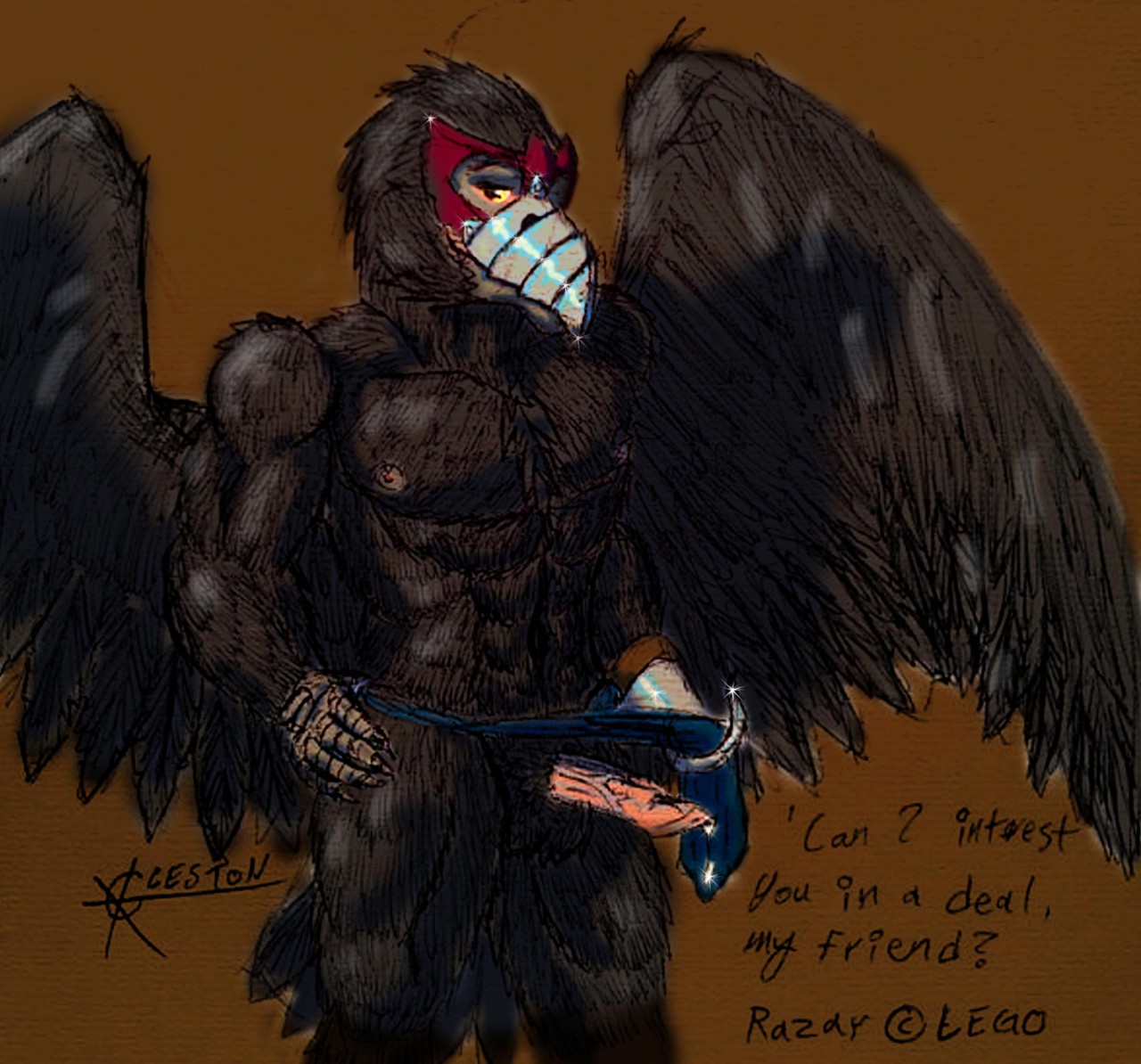 1boyanthroavianballsbirdclawscorviddialogueerectionfeathered wingsfeathersFlag for Deletionflirtinghookleakingloinclothlooking at viewermalemale onlymetallic upper beaknipplespenisprecumraven (bird)razar (character)solowings
