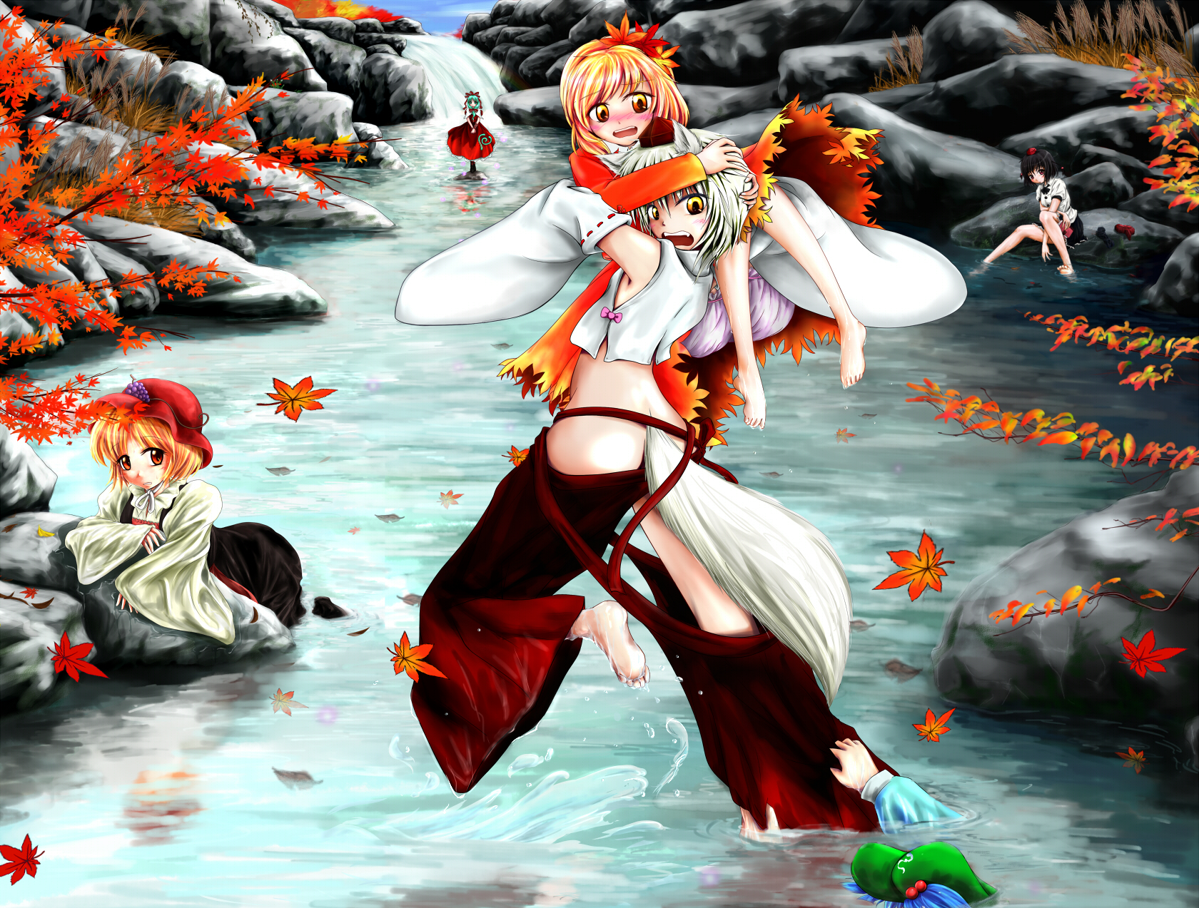 6+girlsanimal earsbarefootblack hairblonde haircarryingdetached sleevesfangsfeetfemale focusgetagreen hairhair bobbleshair ornamenthair ribbonhakamahakama skirthatjapanese clothesleaflooking backmaple leafmultiple girlsno pantiesopen mouthred eyesribbonshort hairskirttailtengu-getatokin hattwintailswadingwardrobe malfunctionwaterwolf earswolf tail