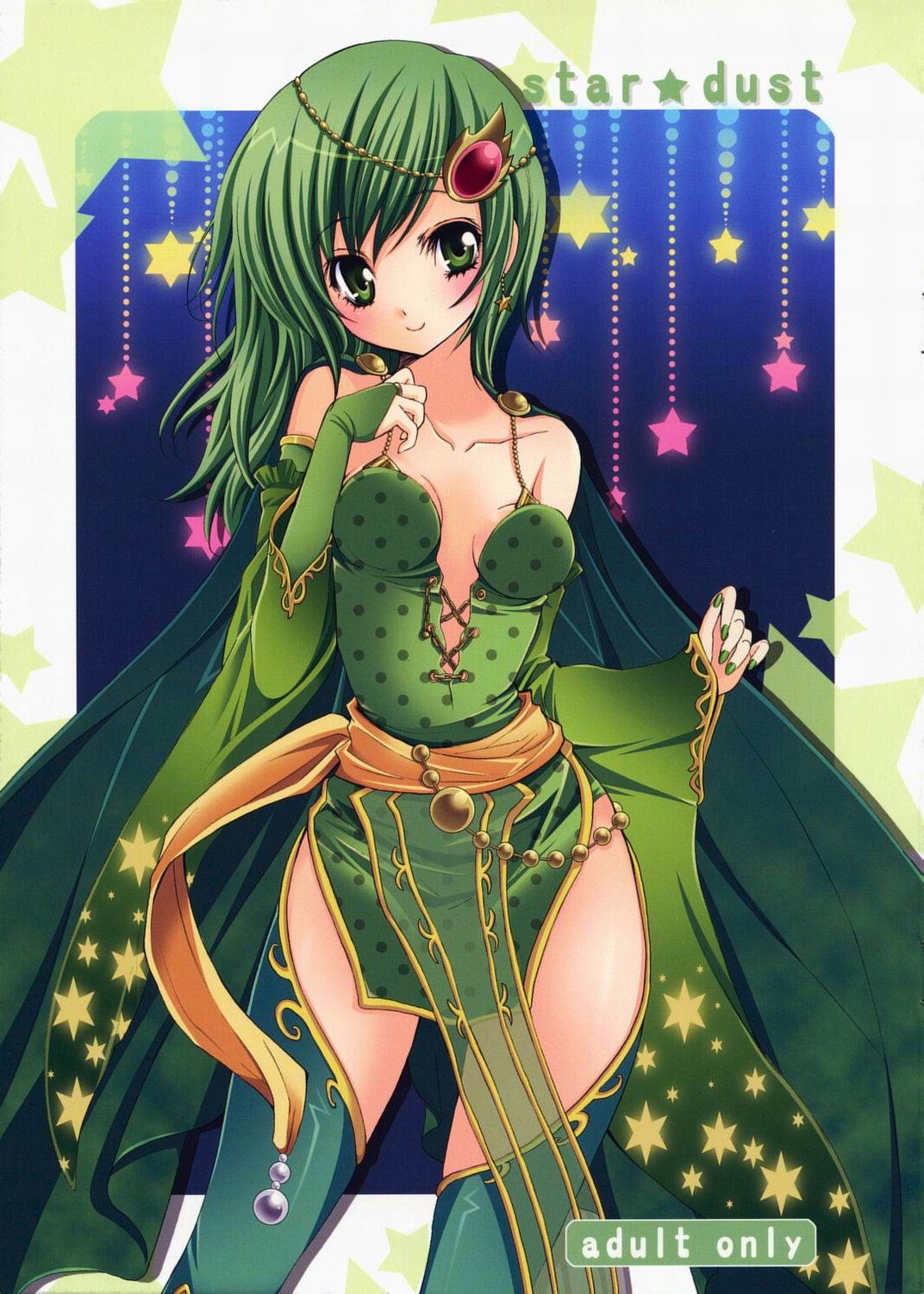 1990s (style)blushbootsbreastscapecleavagedetached sleevesearringselbow glovesglovesgreen eyesgreen hairhair ornamentjewelrylong hairnail (hardware)nail polishretro artstylesmilethigh bootsthighhighsthighs