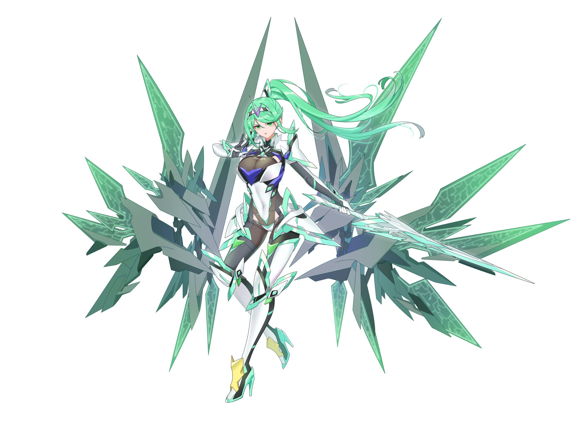 1girlarmorbreastscharacter namechest jewelcore crystal (xenoblade)full bodygreen eyesgreen hairhigh ponytailholdingholding swordholding weaponlong hairmechanical wingsponytailsimple backgroundsoloswordtagstiaraweaponwhite armorwhite backgroundwings