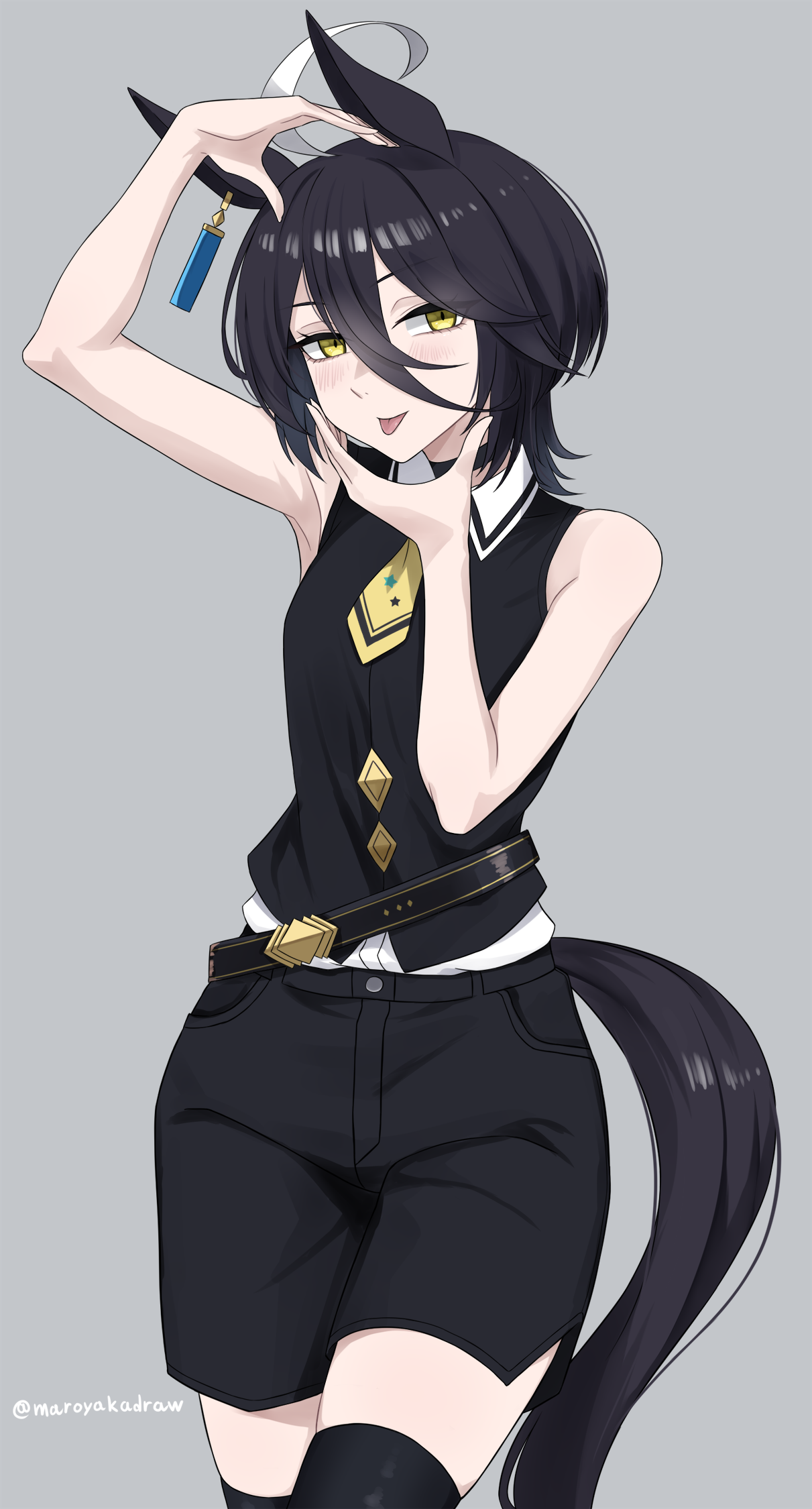 1girlahogealternate hairstyleanimal earsbare shouldersblack chokerblack hairblack shirtblack thighhighsblushbreastschokerclosed mouthear tagearringshair between eyeshorse earshorse girlhorse tailjewelrylong bangslong hairlong hair between eyeslooking at viewermedium hairmulticolored hairnecktieshirtsimple backgroundsingle earringsleevelesssleeveless shirtsmall breastssmilesolotailthighhighstonguetongue outwhite hairyellow eyesyellow necktie