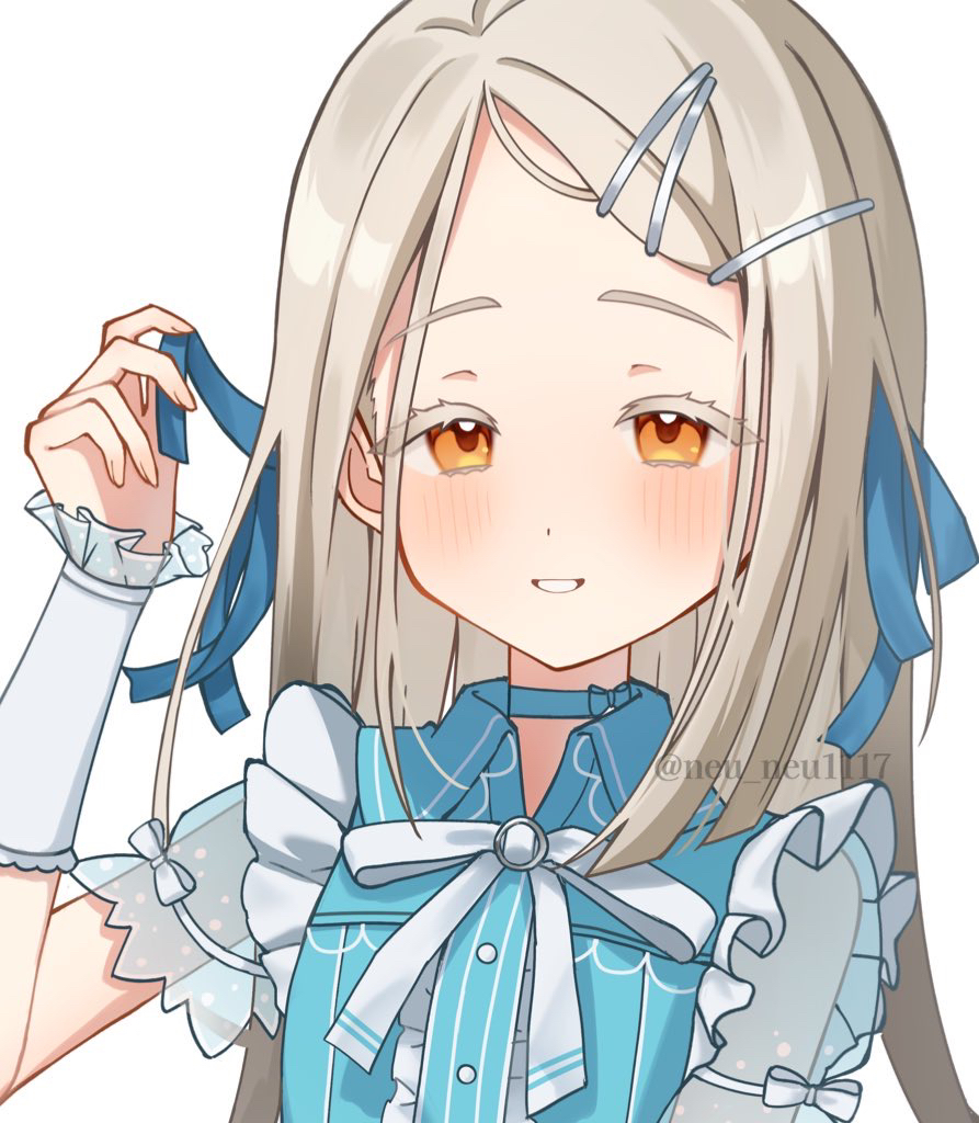 1girlblonde hairblue chokerblue ribbonblue shirtblushcenter frillschokercollared shirtcolored eyelashesdetached sleevesfrillsgradient hairgrey hairhair ornamenthair ribbonhaircliphand upholdingholding ribbonlong hairlooking at viewermulticolored hairneck ribbonopen mouthorange eyesparted bangsribbonsee-through clothessee-through sleevesshirtshort sleevessimple backgroundsmilesolotwitter usernametwo-tone shirtupper bodywatermarkwhite backgroundwhite ribbonwhite shirt