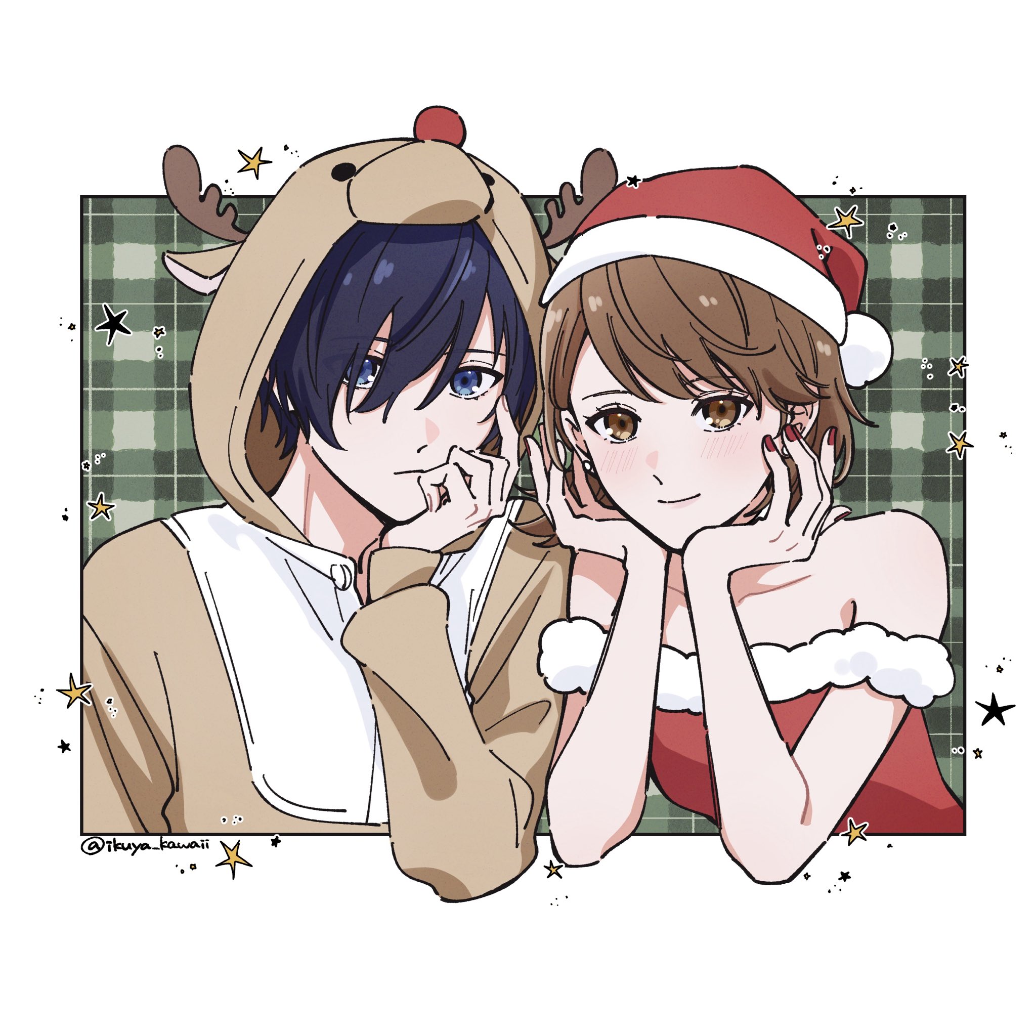 1boy1girlalternate costumeanimal costumeanimal earsanimal hoodantlersbare armsbare shouldersblue eyesblue hairblushborderbrown eyesbrown haircheckered backgroundchristmasclosed mouthcollarbonedeer earsdressearringselbow restfake animal earsflipped hairfur trimfur-trimmed dressfur-trimmed headwearhair between eyeshand on own facehathead resthoodhornsjewelrylooking at vieweroutside borderpom pom (clothes)red dressred nailsreindeer antlersreindeer costumesanta costumesanta hatshort hairsmilestar (symbol)stud earringsupper bodywhite border