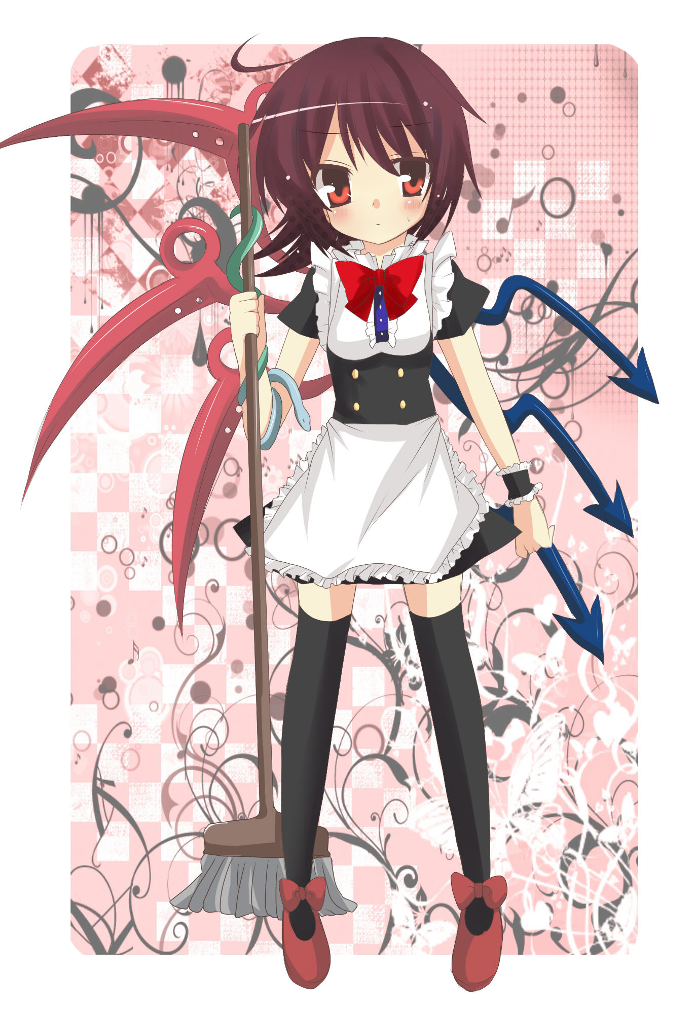 1girlahogealternate costumeasymmetrical wingsblack hairblack thighhighsfemale focusfull bodymaidmopred eyesribbonshort hairsolothighhighswings