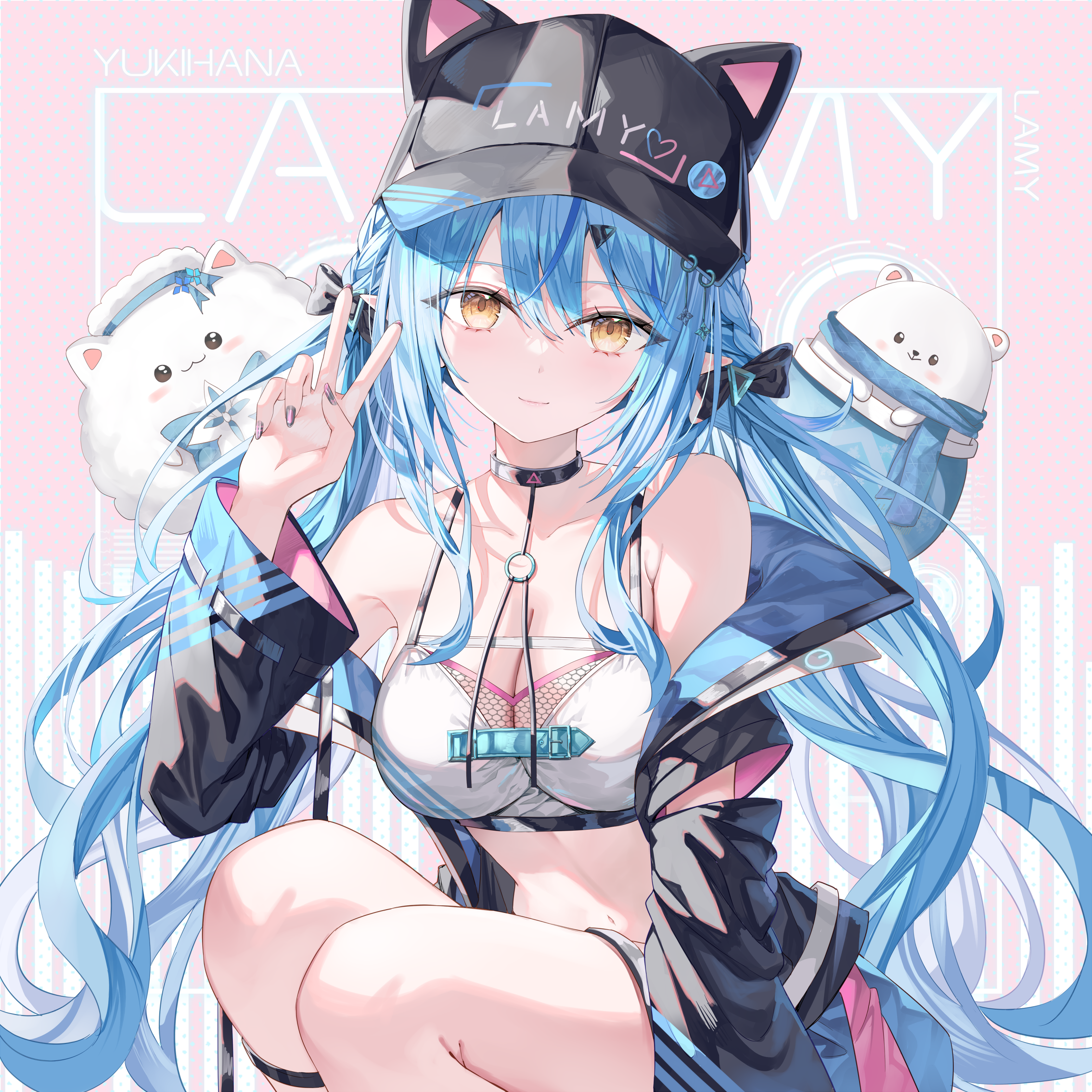 1girlahogeanimal hatbaseball capblack bowblack chokerblack hatblack jacketblue hairbowbraidbreastscat hatcharacter namechokercleavagedouble-parted bangselffishnet topfishnetshair between eyeshair bowhand uphatheartheart ahogejacketlarge breastslong hairlooking at viewerlow twintailsnaveloff shoulderofficial alternate costumeofficial alternate hairstyleofficial artist extrapink backgroundpointy earsside braidssittingsolosports bratext backgroundtwintailsvvirtual youtuberwhite sports brayellow eyes