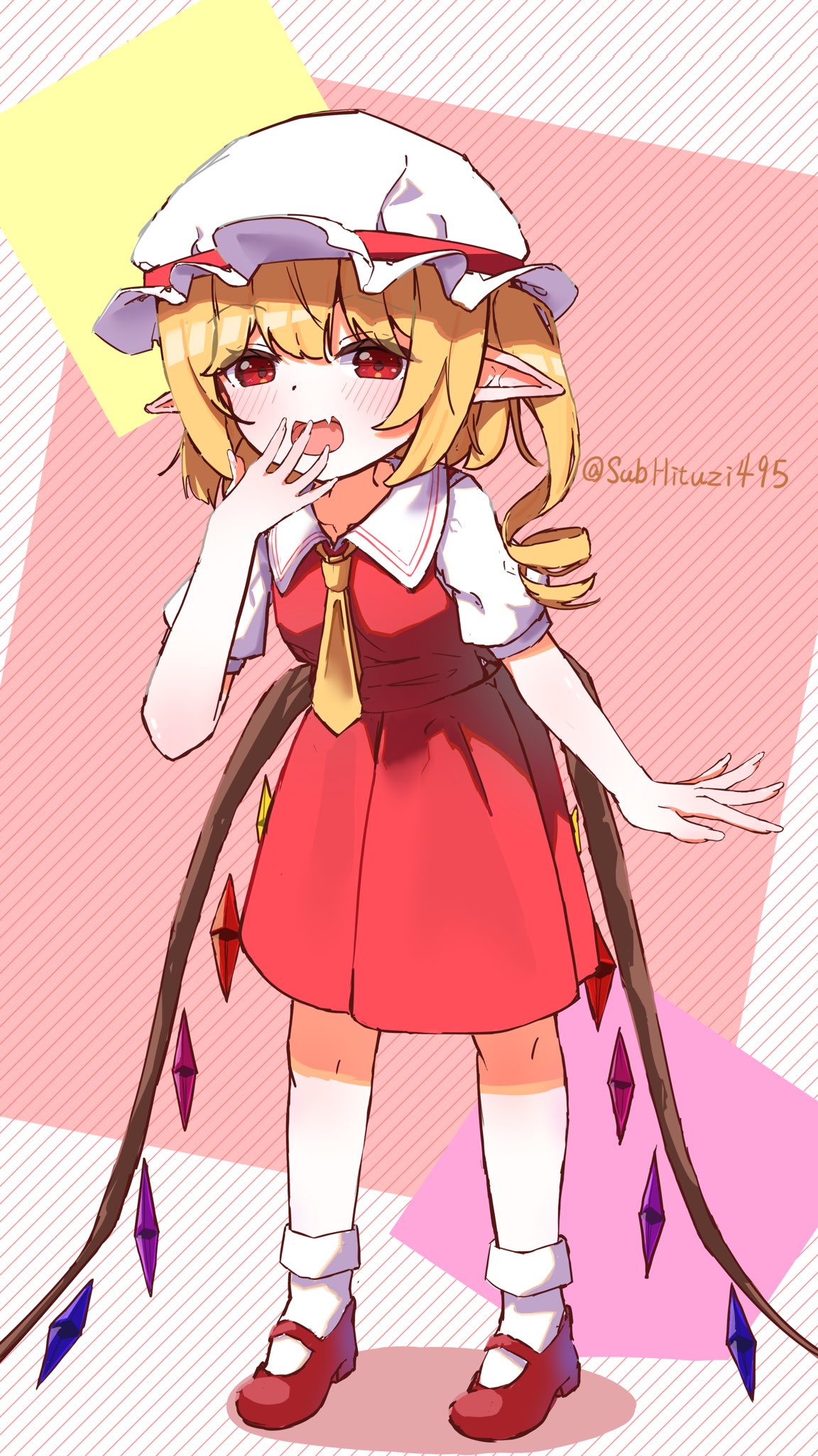 1girlblonde hairblushcollared shirtcrystalcrystal wingsfanghatlong hairlooking at viewermary janesmesugakimesugaki posemob capmulticolored wingsnecktieone side uppointy earspuffy short sleevespuffy sleevesred eyesred shoesred skirtred vestshirtshoesshort sleevesskin fangskirtskirt setsockssolosubhituzi495twitter usernamevestwhite hatwhite shirtwhite sockswingsyellow necktie