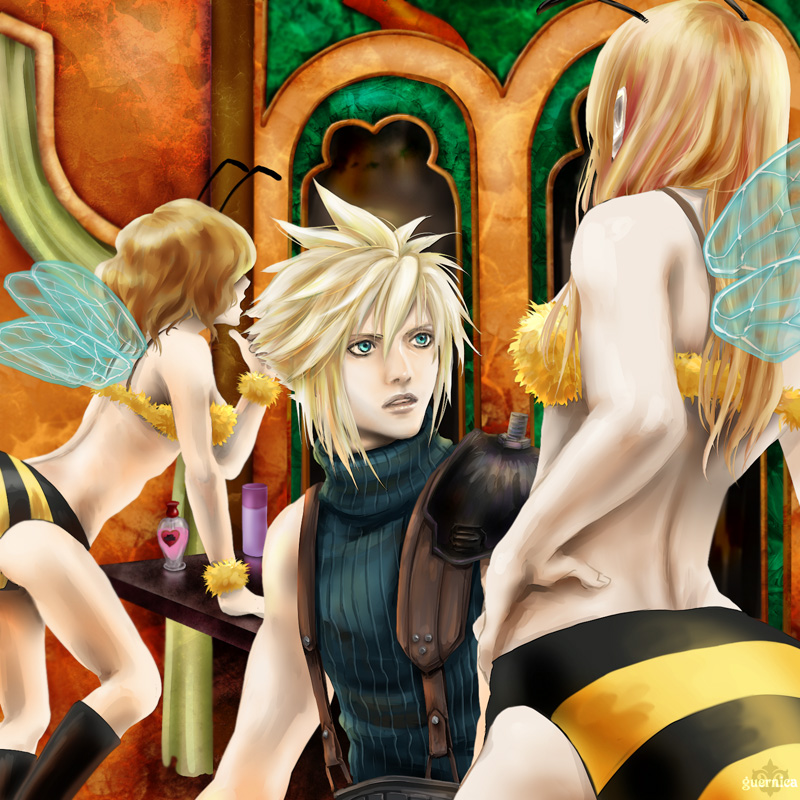 1boy2girlsantennaearthropod girlbare backbare shouldersbee costumebee girlblonde hairblue eyesbrabrown haircosplayhoney bee inninsect wingslingerielong hairmultiple girlsshort hairsocksspiked hairunderwearwingswristband
