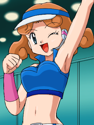 1girlarm upbeltblue eyesblue hatblue shirtbreastsbrown hairceilingceiling lighthatlarge breastslooking at viewermidriffnavelone eye closedopen mouthshirtshort hairsleevelesssleeveless shirtsmilestandingupper bodyvisor capwhite beltwinkwristband