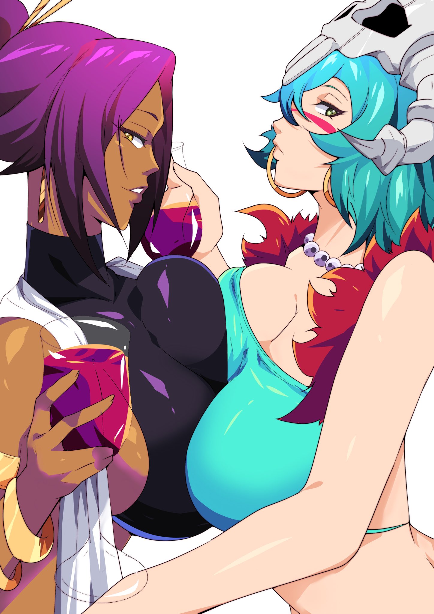 20242girlsbare shouldersbraceletbreastsbreasts squeezed togethercollarbonecupdark skindark-skinned femaledrinking glassearringsespadafacial markgreen eyesgreen hairhair ornamentholding wine glasshollow maskhoop earringsjewelrylarge breastslong hairmaskmask on headmultiple girlsparted lipsponytailpurple hairsimple backgroundskull on headwhite backgroundwine glassyellow eyes