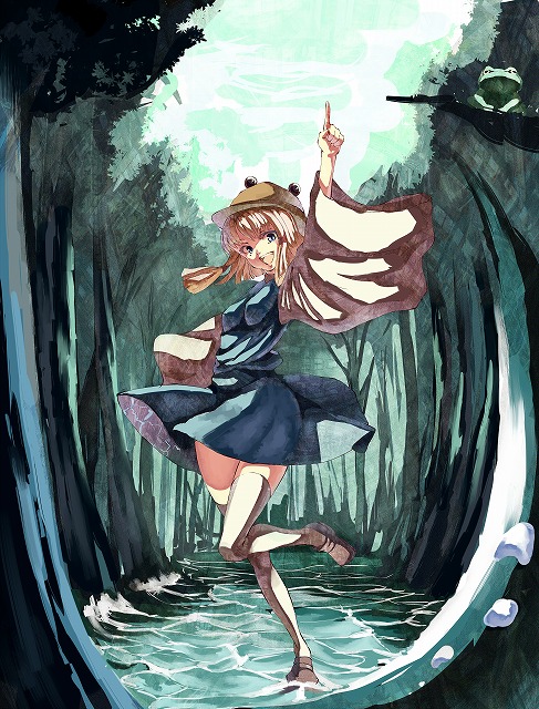 1girlblonde hairbreastsfemale focusfroghatnatureopen mouthoutdoorsoutstretched armplantpointingpointing upskirtskysmilesolostandingstanding on one legthighhighswaterwhite thighhighszettai ryouiki