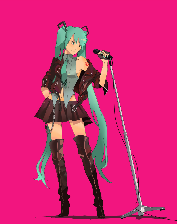 1girlbootscablechainfemale focusfull bodygreen eyesgreen hairhair ribbonjacketlong hairmicrophonemicrophone standnecktieoff shoulderribbonsimple backgroundsleeves rolled upsolostandingthighhighstwintailszettai ryouiki