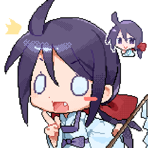 0 01boy1girlahogeblack hairblushblush stickersbowcenterwakemaniachibidot nosefangfinger to cheekgoheihair between eyeshair bowholdingholding goheijapanese clotheslong haironmyoujiopen mouthpixel artponytailred bowsimple backgroundsolowhite backgroundwide sleeves