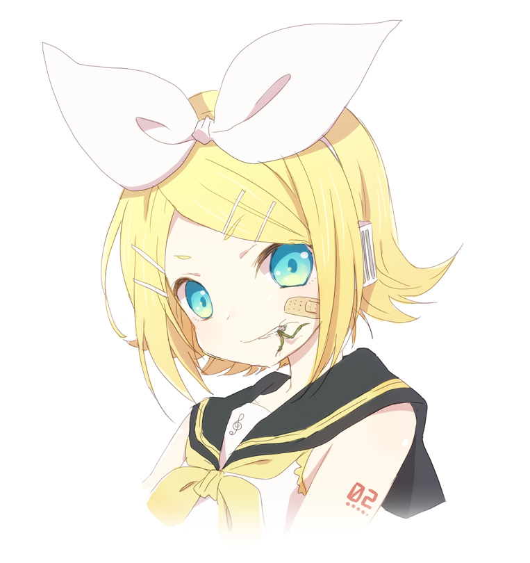 1girlaqua eyesbandaidbandaid on faceblonde haireatingfemale focushair ornamenthair ribbonhairclipheadphonesportraitpraying mantisribbonshort hairsimple backgroundsoloupper bodywhite background