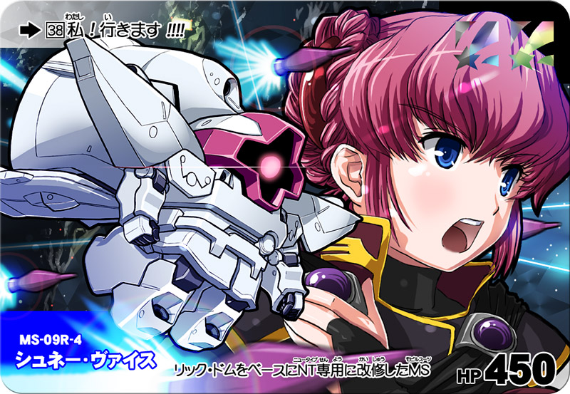yone, haman karn, rick dom, char's deleted affair, gundam, sd gundam, 1girl, aged down, blue eyes, blush, female focus, furigana, mecha, nonstandard furigana, open mouth, pink hair, robot, rounded corners, solo