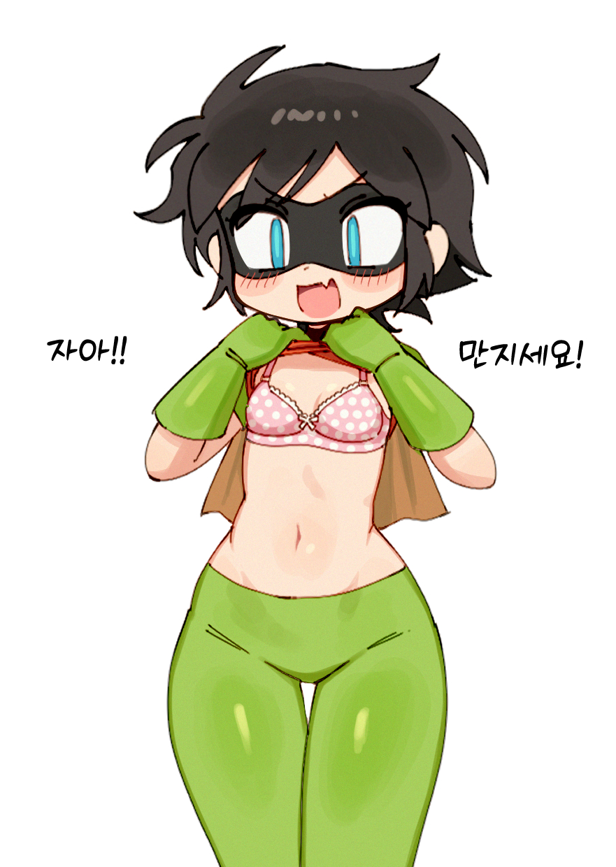 batrobin k, robin (batrobin k), batman (series), dc comics, highres, translation request, 1girl, black hair, black mask, blue eyes, bra, breasts, clothes lift, domino mask, eye mask, fang, gloves, green gloves, korean text, leotard, mask, navel, shirt lift, short hair, simple background, skin fang, sleeved leotard, small breasts, solo, spandex, superhero costume, thigh gap, underwear, white background