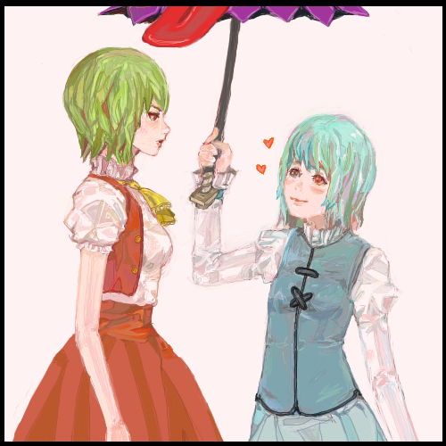 kazami yuuka, tatara kogasa, touhou, lowres, 2girls, female focus, heterochromia, multiple girls