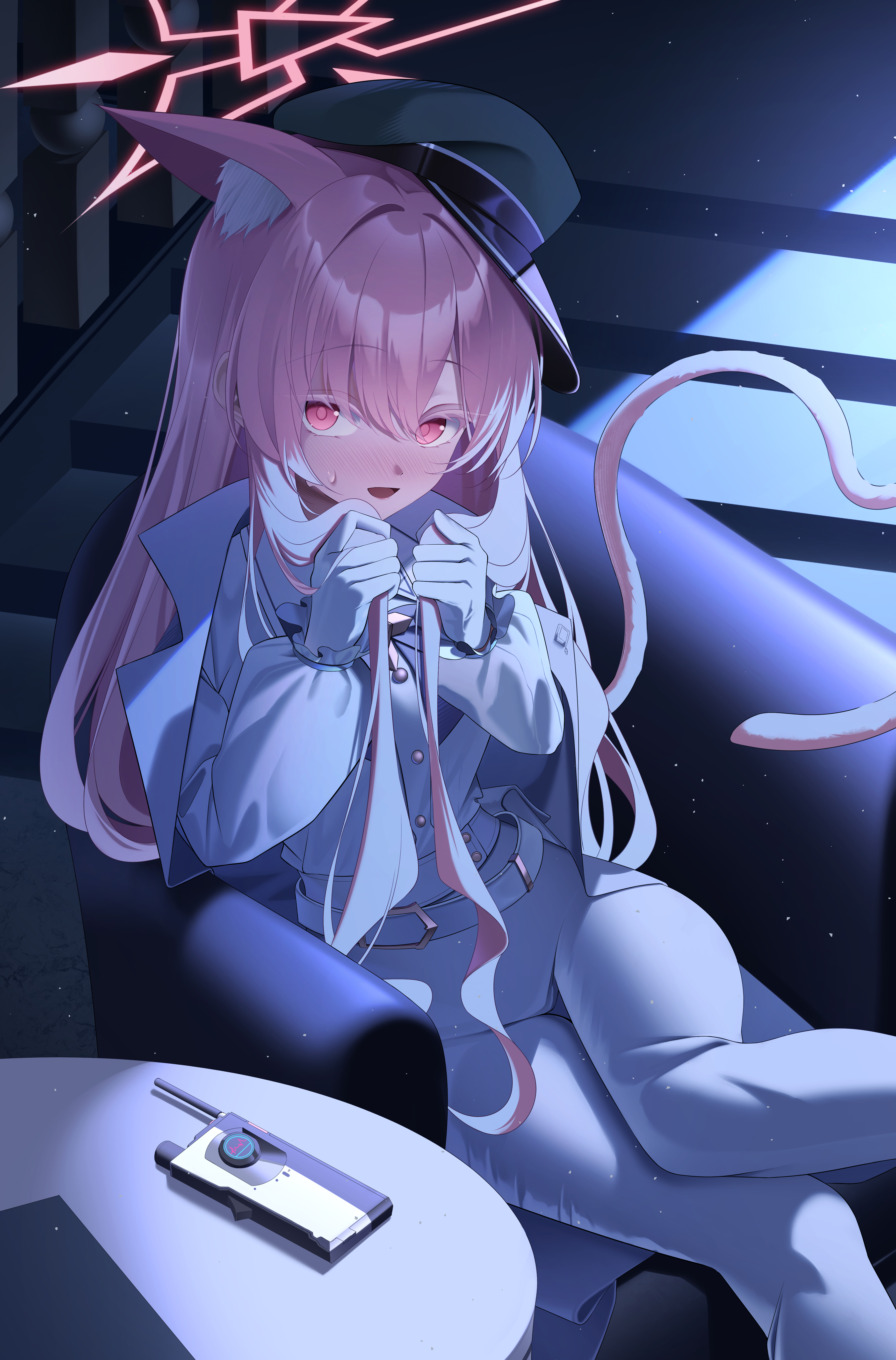 1girlanimal ear fluffanimal earsblushcat earscat girlcat tailextra earsglovesgreen hathair between eyeshalohatholdingholding own hairjacketlong hairlooking at vieweropen mouthpantspeaked cappink hairpink halored eyesshirtsidelockssolosweatdroptailwhite gloveswhite jacketwhite pantswhite shirt