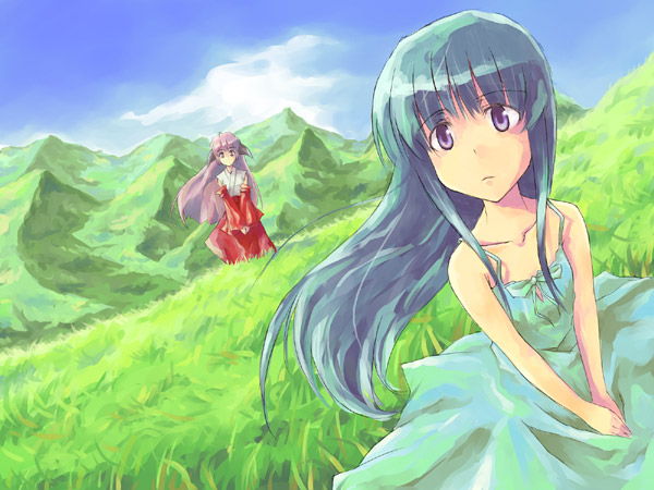 hina (guardian hearts), ooba maya, powawa, guardian hearts, highres, non-web source, 00s, 2girls, bike shorts, blush, bow, brown hair, hair bow, hime cut, long hair, multiple girls, pink eyes, ponytail, purple eyes, purple hair, school uniform, serafuku, skirt