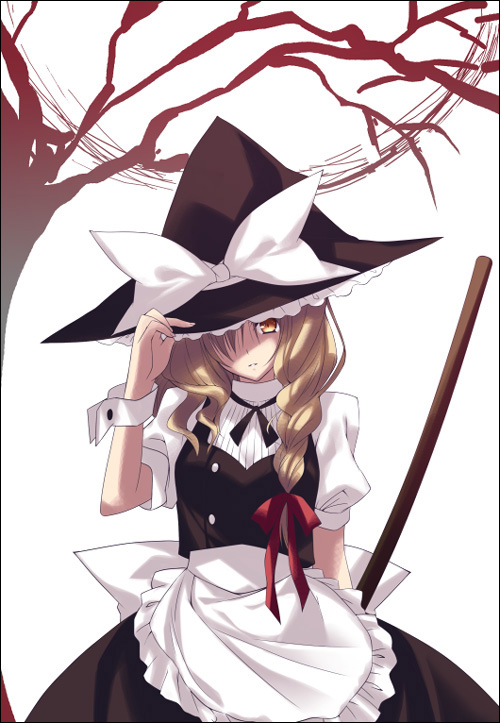 1girlapronblonde hairbraidbroomembellished costumefemale focushair over one eyehair ribbonhand on headwearhatlong hairneck ribbonribbonside braidsolostandingtreewaist apronwitch hat