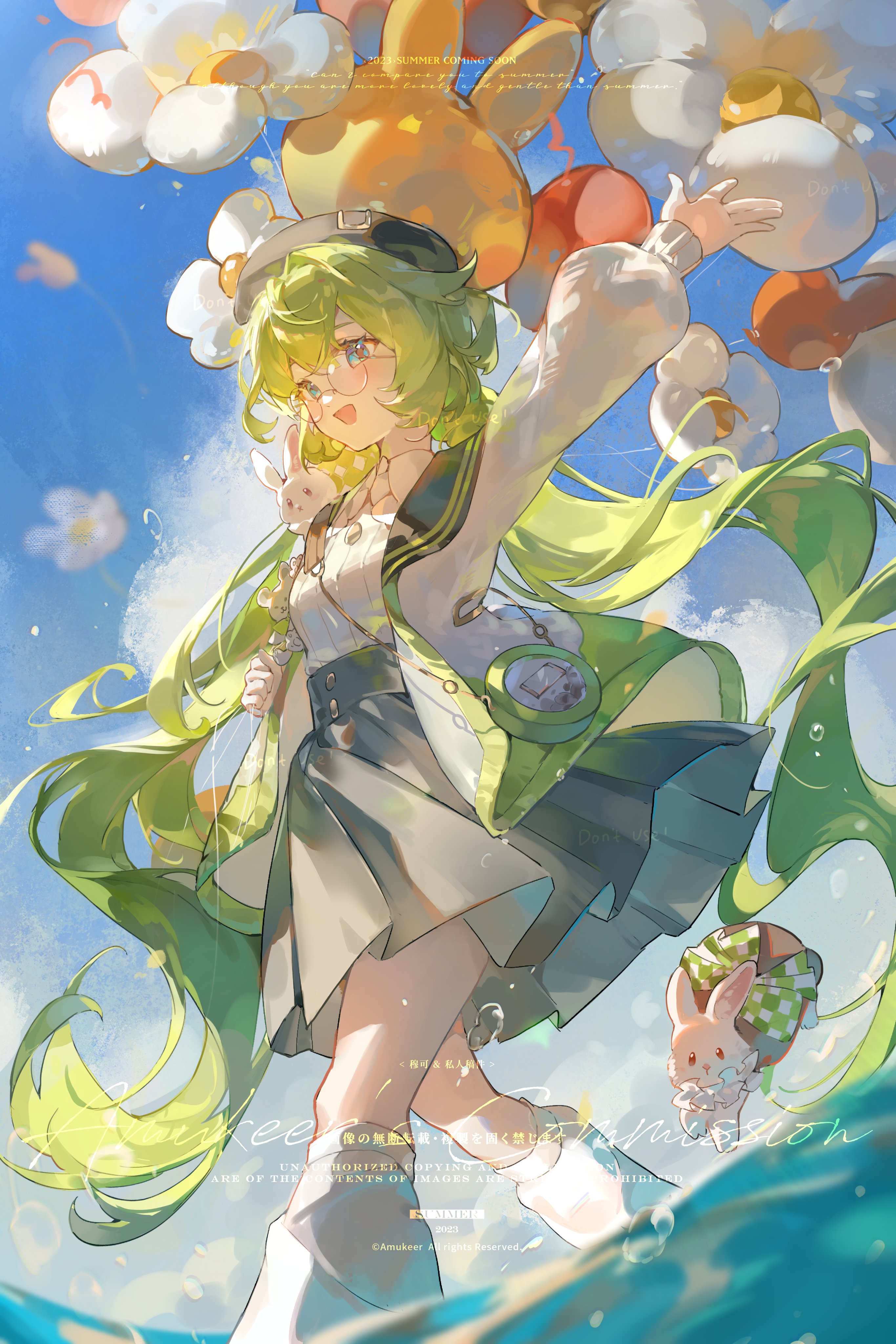 1girlanimalanimal on shoulderbagballoonblack skirtblue eyesblue skycloudcollared shirtdayfeet out of frameflowerglassesgreen hairhatjacketlong hairlong sleevesopen clothesopen jacketopen mouthoutdoorspleated skirtpuffy long sleevespuffy sleevesround eyewearshirtshoulder bagskirtskysmilesolotwintailsvery long hairwhite flowerwhite shirt