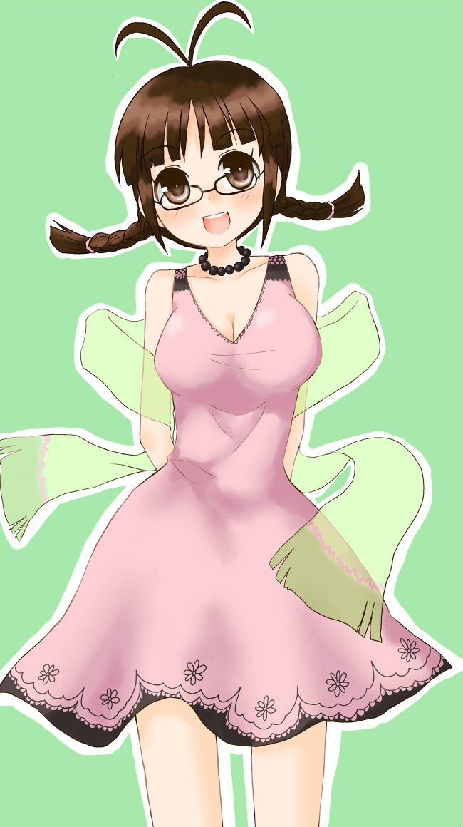 00s1girlahogeblushbraidbrown eyesbrown hairdressfemale focusglassesjewelrynecklacepearl necklacescarfsolotwin braids