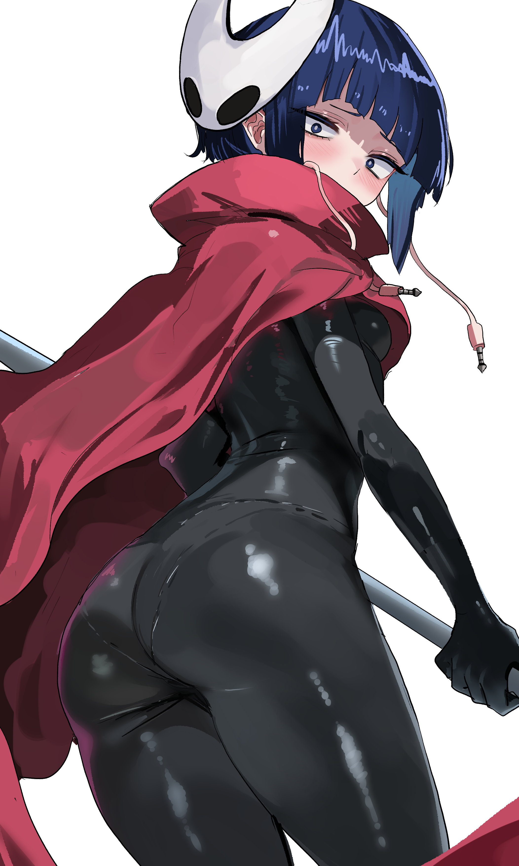 1girlassaudio jackblack bodysuitblack eyesblue hairblunt bangsbodysuitbreastscloakcosplayfrom behindhornet (hollow knight) (cosplay)long earlobeslooking at viewerlooking backmaskmask on headneedle (hollow knight)red cloakshort hairsidelockssimple backgroundsmall breastssolowhite backgroundwhite mask