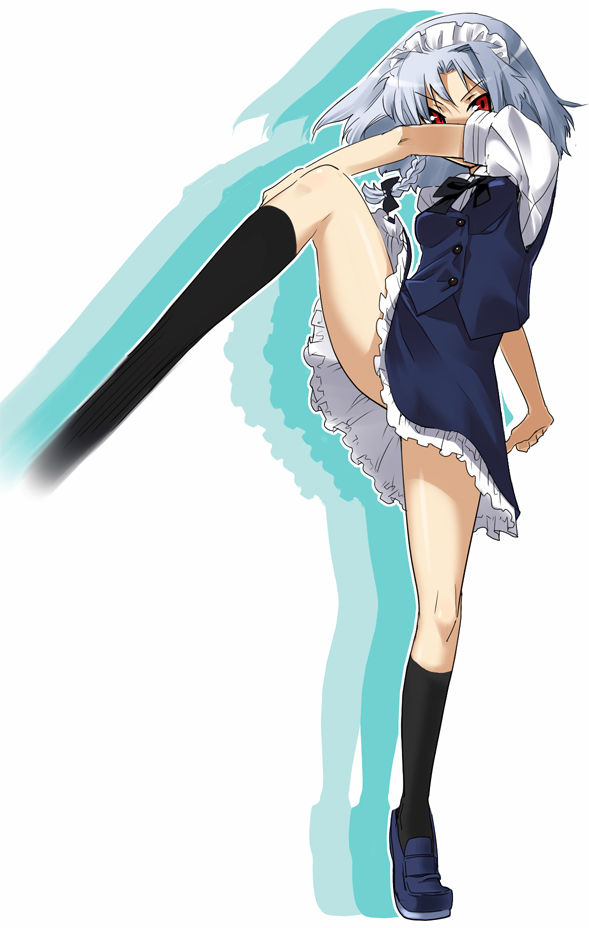 1girlbraidfemale focusfull bodymaidred eyesribbonshort hairskirtsockssolotwintailswhite background