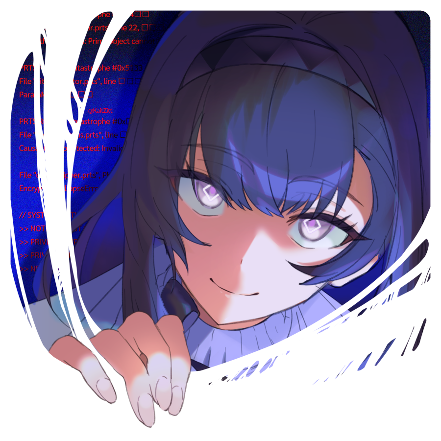 1girlblack hairblack hairbandborderclosed mouthfingernailsfourth wallhairbandlooking at viewermedium hairportraitpurple eyessmilesolostaringtransparent border