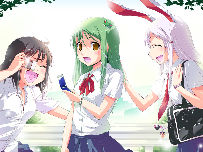 3girlsalternate costumealternate hairstyleanimal earsbagblack haircameracellphonecellphone charmcharm (object)contemporaryfemale focusgreen hairhair ornamenthaircliplong hairmultiple girlsphonepurple hairrabbit earsribbonschool uniformserafukushirtshort hair
