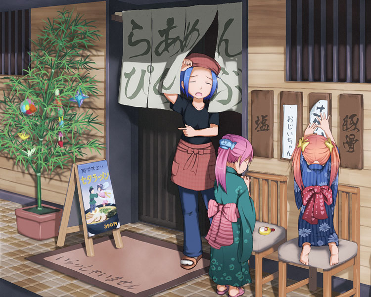 3girlsbannerbarefootblack shirtblousebrown hairchairchilddayjapanese clotheskimonokneelingmultiple girlsnorenoutdoorsown hands claspedown hands togetherpink hairplantpointy earsponytailprayingshirtshopslice of lifesocksstandingtwintails