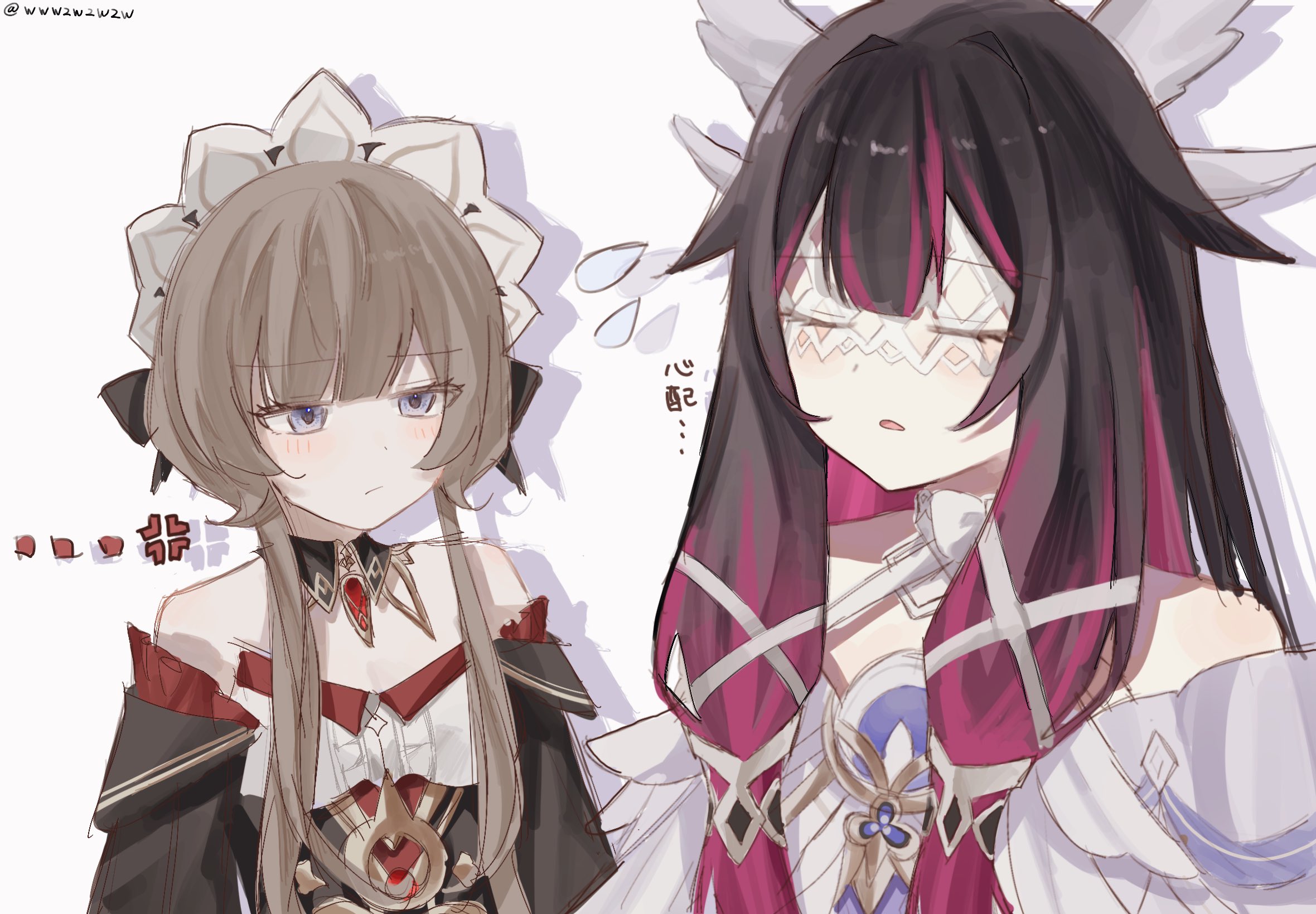 :o2girlsanger veinbare shouldersbrown hairclosed eyescolored inner hairdetached sleevesdouble-parted bangsdrop shadoweye maskflying sweatdropsfrownhair ornamentlong hairlooking at anothermulticolored hairmultiple girlsparted lipspink hairshort hair with long lockssketchtwitter usernameupper bodywhite backgroundwhite maskwing hair ornamentwww2w2w2w